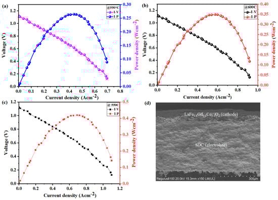 The electrochemical performance of the prepared LaFeO3, LaFe0.9Gd0.05Ce0.05O3-δ, and LaFe0.8Gd0.1Ce0.1O3-δ as air electrodes was demonstrated in SOFC at 550 °C over the SDC electrolyte. Figure 5c displays a typical current (I)–voltage (V) and I-P characteristics curve of fabricated fuel cells. An OCV of over 1.1 V and the maximum power density (Pmax) of 0.419 W cm−2 using the LaFe0.8Gd0.1Ce0.1O3-δ cathode were compared to using LaFeO3, Pmax of 0.245 W cm−2 (Figure 5a) and Pmax of 0.338 W cm−2 (Figure 5b) for LaFe0.9Gd0.05Ce0.05O3-δ cathodes, respectively at 550 °C. The high electrochemical performance achieved by the LaFe0.8Gd0.1Ce0.1O3-δ cathode over individual LaFeO3 and LaFe0.9Gd0.05Ce0.05O3-δ samples suggests co-doping of Gd and Ce and plays an essential role in improving ORR electrocatalytic activity by leading lower barrier O2- transport and its migration energy [12,17] since the catalytic process at the cathode surface is a multistep process, and the LaFe0.9Gd0.05Ce0.05O3-δ could be enriched with oxygen vacancies, which would enhance the capability of capturing valance electrons to improve the electrical conductivity as well. Moreover, the cross-sectional SEM of the fuel cell using the LaFe0.9Gd0.05Ce0.05O3-δ cathode over the GDC cathode after fuel-cell testing is performed to the individual layer in the cell components, as shown in Figure 5d.