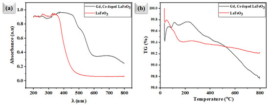 Additionally, a wide range of spectroscopic methods, including UV–visible, TGA, Raman, and X-ray photoelectron spectroscopy, were used to investigate additional structural characteristics of LaFeO3 and Gd/Ce co-doped LaFeO3 powders. Figure 6a shows the absorbance spectra of pure LaFeO3 and LaFe0.8Gd0.1Ce0.1O3-δ measured by UV–visible spectroscopy. It is possible to see a substantial difference in the absorbance spectra of the as-synthesized LaFeO3 and LaFe0.8Gd0.1Ce0.1O3-δ powders. The variations in the absorbance spectra indicate that the LaFeO3-δ energy band gap is lowered with the doping of Gd and Ce; this is only possible because of the creation of oxygen vacancies. This is widely reported when a large number of oxygen vacancies are produced, which also reduce the metal oxides’ energy band gaps [30,31].