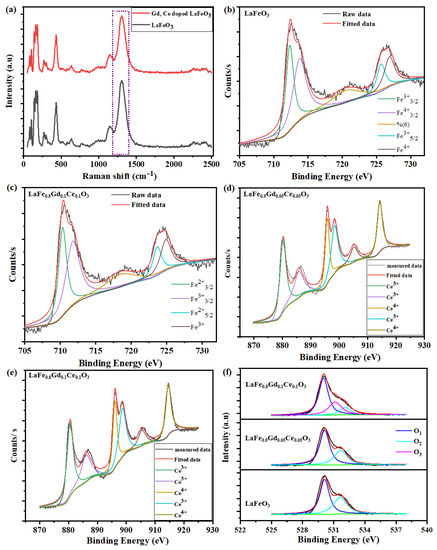 (a) Raman spectra of LaFeO3 and LaFe0.8Gd0.1Ce0.1O3-δ (b,c) Fe-2p X-ray photoelectron spectra of LaFeO3-δ individual powders and after doping of Gd and Ce to form LaFe0.8Gd0.1Ce0.1O3-δ. (d,e) Ce-3d, XPS spectra of LaFe0.9Gd0.05Ce0.05O3-δ and LaFe0.8Gd0.01Ce0.1O3-δ sample and (f) O1s spectra, respectively.