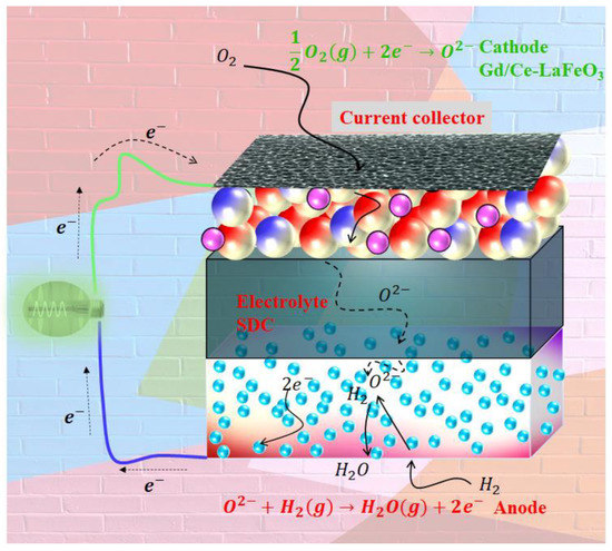 Schematic diagram of the different steps for electrochemical processes from fuel converting the fuel energy into electricity of Gd/Ce-doped LaFeO3-based cathode fuel cell over SDC electrolyte.