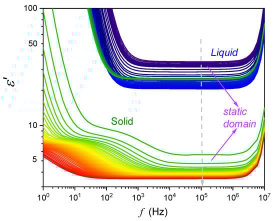 The real part of dielectric permittivity obtained in isothermal pressure measurements at . The static domain related to ‘horizontal’, frequency independent, and defining dielectric constant is indicated. For frequencies below the static domain, the rise is associated with residual ionic contaminations. For frequencies above the static domain, the impact of relaxation processes emerges.