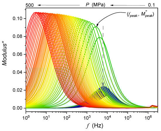 The translational dynamics can be tested based on DC electric conductivity data or a dielectric modulus loss curve, as indicated in Section 2. It allows for the minimizing of the impact of emergent low-frequency relaxation processes. The maximum of dielectric loss curves is defined by the peak frequency, determining the relaxation time and its height: namely and . The latter can be linked to the energy associated with the relaxation process [49]. For the isothermal pressure-related dynamics, the Super-Barus relation, a pressure counterpart of the Super-Arrhenius equation, is generally considered [34,59,60]:
