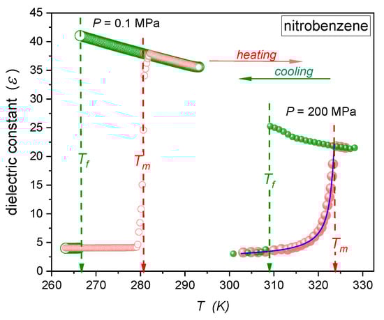 Figure 3 presents changes in the dielectric constant for nitrobenzene on cooling from the liquid phase, which is associated with the freezing temperature , and on heating from the solid state with liquidation when passing the melting temperature . The results are for tests under atmospheric pressure, and . There are no hallmarks of the premelting effect under atmospheric pressure. However, when compressing the system up to , the strong and long-range premelting effect appears for and the dielectric constant increases almost six times at a distance of ca. 20 K. The anomaly is well reproduced by the dependence consistent with Equations (6) and (8):