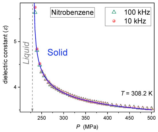 Pretransitional anomaly of dielectric constant appearing for isothermal compressing in solid nitrobenzene. Experimental data are for two measurement frequencies indicated in the figure. The curve portraying the effect is described by Equation (10) with the following parameters: amplitude , singular pressure , the exponent , and .