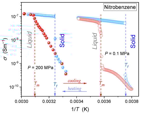 The Arrhenius-scale plot of DC electric conductivity in nitrobenzene on cooling from the liquid phase, passing the freezing temperature (in light blue), and on heating from the solid phase, passing the melting temperature , under atmospheric pressure (, open circles), and (full circles).
