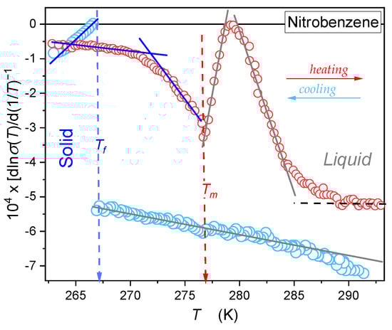 Figure 5 shows that in liquid nitrobenzene on cooling, DC electric conductivity seems to follow the linear behavior, which can be considered as the ‘proof’ for the basic Arrhenius pattern with . In the solid phase, a kind of ‘dynamic’ premelting effect seems to emerge when passing on cooling. For the heating from the solid phase, at , strong non-Arrhenius premelting changes in the temperature range covering almost 30 K emerge in solid nitrobenzene. Weaker but still notable pretransitional changes manifested as a distortion from the linear behavior are visible in liquid nitrobenzene, above .