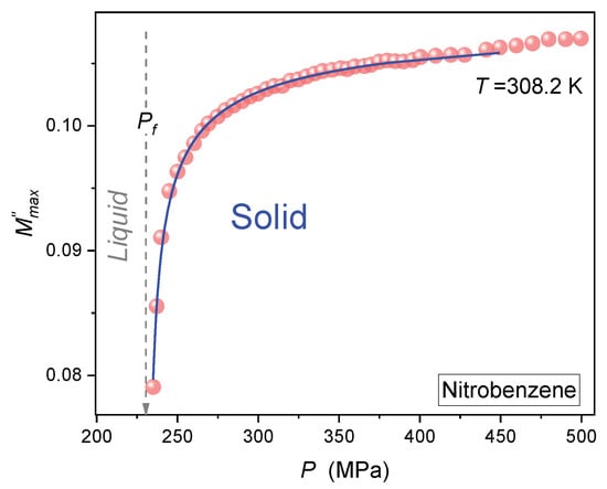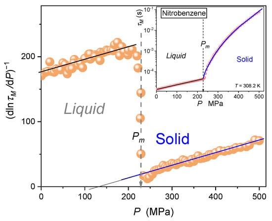 The inset in Figure 7 shows changes in the modulus-related relaxation time on compressing from liquid nitrobenzene. The ‘visual inspection’ of can suggest the basic Barus dynamics ( in liquid nitrobenzene and definitively non-Barus for the solid nitrobenzene (see Equation (16). However, also for the pressure path, one can define the steepness index to carry out the distortions-sensitive analysis [59,60]: