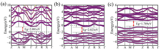Electronic band structures of (a) pristine BaTiO3, (b) Ba site doping, and (c) Ti site doping.