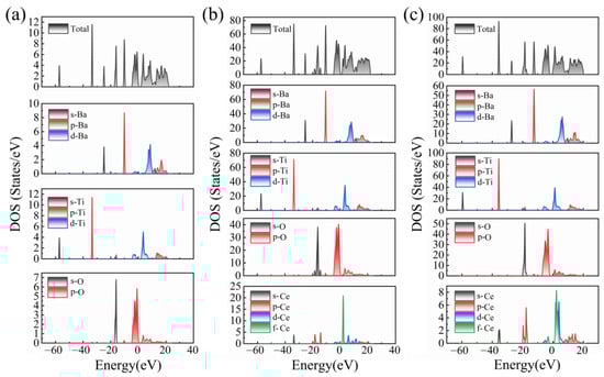 In order to further understand the mechanism of electronic structure, the total density of states (TDOS) and partial density of states (PDOS) of pristine and Ce-doped BaTiO3 were computed at the optimized crystal structure, as shown in Figure 3. For pristine BaTiO3, it can be observed that Ba has little contribution to the CBM and VBM. It just acts as a charge balancer to balance the system charge [36]. All unoccupied Ti 3d states are strongly hybridized with nearby O 2p states, and the CBM is mainly determined by the unoccupied Ti 3d transition metal states. As a result, the band gap is attributed to the energy magnitude of Ti 3d and O 2p states. For Ce-doped BaTiO3, as shown in Figure 3b,c, the main characteristics of CBM and VBM are consistent with pure BaTiO3. The VBM is still mainly hybridized by the Ti 3d and O 2p states, and the CBM is determined by the Ti 3d states and the presence of the Ce 5d and 4f states. The substitution of Ba, which results in the presence of impurity bands in the conduction band, is attributed to the metallization of the crystal structure.