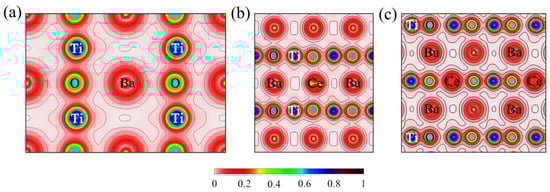 For insight into the nature of chemical bonds before and after doping, the charge density distribution maps of pure and Ce-doped BaTiO3 along the (0 0 1) plane have been calculated, respectively. As shown in Figure 4, in the presence of O 2p and Ti 3d hybrid states, Ti and O atoms form weak covalent bonds, whereas the Ba-O bond shows an ionic bond nature. When Ce was doped into the Ba and Ti sites, the nature of the ionic and weak covalent bonds between Ce and O was observed, respectively.