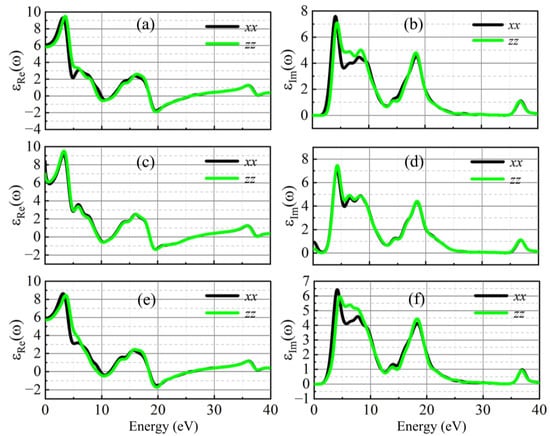 The real and imaginary parts of the dielectric function: (a,b) pure BaTiO3, (c,d) Ba0.875TiCe0.125O3, and (e,f) BaTi0.875Ce0.125O3.