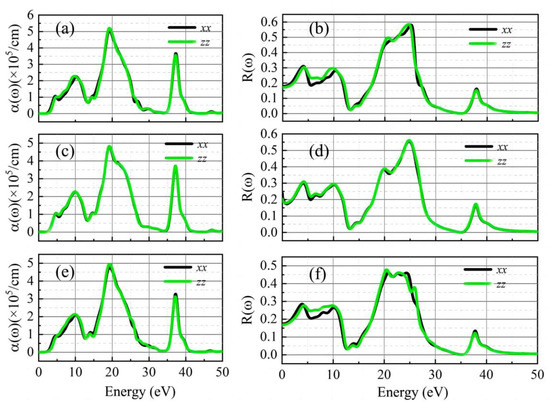 Figure 6 shows the absorption coefficient and reflectivity of these materials in different directions. As shown in Figure 6a,c,e, the incorporation of Ce slightly affects the absorption of incident light. Several moderate absorption peaks can be observed within the photon energy range of 0–15 eV. The absorption peaks of all the investigated materials are significantly enhanced with the photon energy increased continuously in the ultraviolet range. Although the lattice parameters show anisotropy in the x- and z-axis, all perovskites obtain almost identical absorption spectra along different directions. For pure BaTiO3, the maximum absorption coefficient approaches 5.10 × 105 cm−1 at 19.26 eV and 5.20 × 105 cm−1 at 19.20 eV in the x- and z-axis, respectively. The maximum absorption coefficient of Ba0.875Ce0.125TiO3 reaches 4.80 × 105 cm−1 at 19.23 eV in the x-axis and 4.82 × 105 cm−1 at 19.23 eV along the z-directions, respectively. In addition, there is a small absorption peak within the range of 3–6 eV, which is consistent with the experimental results [45,46]. In terms of BaTi0.875Ce0.125O3, the maximum absorption coefficient closes to 4.78 × 105 cm−1 at 19.29 eV. Figure 6b,d,f illustrate the reflectivity of the materials. For the pristine and the substitution of Ce for the Ti site, the materials exhibit a slight difference in the x- and z-axis, whereas the reflectivity is almost identical in both directions for the substitution of Ce for the Ba site. The intensity of reflection along the z-axis is stronger than that in the x-axis for all materials in the ultraviolet range of 5–10 eV. Several moderate reflection peaks can be observed in the low ultraviolet range (below 15 eV), whereas all materials show the strongest reflection peaks within the photon energy range of 15–20 eV. In addition, the maximum reflection of BaTiO3 reaches 0.58 at 25.10 eV on the x-axis and 0.59 at 24.69 eV on the z-axis, respectively. For the Ba site substitution, the maximum reflection in the x- and the z-axis is 0.55 at 24.78 eV and 0.56 at 24.78 eV, respectively. In the case of Ce doping at the Ti site, the maximum reflection approaches 0.46 at 20.84 eV and 0.48 at 20.47 eV, respectively. It can be concluded that both the Ba and Ti sites of Ce-doped BaTiO3 can reduce the reflectivity of the material.