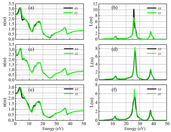 In addition, the refractive index and energy loss function (ELF) of the materials have been calculated to study the optical transparency and energy state of the electrons, respectively. As seen in Figure 7a,c,e, the refractive index of these materials in visible light and a large part of the low ultraviolet range are larger than one unity. The refractive index of the investigated materials decreases to less than one unity with the photon energy increase to the range of 10–13 eV as well as beyond 20 eV. Studies have shown that materials with a refractive index greater than or equal to one unity are transparent to incident light [47]. Therefore, it can be concluded that the materials are transparent to incident light when the photon energy is below 10 eV, and non-transparent in the ultraviolet range of 10–13 eV and beyond 20 eV. For pure BaTiO3, the maximum refractive index is recorded as 3.11 at 3.27 eV at the x-axis and 3.14 at 3.64 eV at the z-axis. For Ce doping at the Ba site, the maximum refractive index approaches 3.09 at 3.44 eV at the x-axis and 3.14 at 3.53 eV at the z-axis. In the case of Ti site doping, the calculated maximum refractive index along the x- and z-directions is the same, which is recorded as 2.99 at 3.27 eV. The energy loss function (ELF) represents the energy loss process of rapidly moving electrons passing through the materials, attributed to the plasmon resonance due to oscillations of valence electrons. As shown by peaks in Figure 7b,d,f. The energy of the maximum peaks occurs at is zero, which is generally recorded as the volume plasma frequency . For pure BaTiO3, the plasma frequency values () along the x- and z-axes is estimated to be 25.79 eV and 25.67 eV, respectively. In terms of the doping of Ce at the Ba site, the is almost the same along different directions, which is recorded as 26.71 eV. For Ti site doping, the is recorded as 26.50 eV and 26.3 eV in the x- and z-directions, respectively.