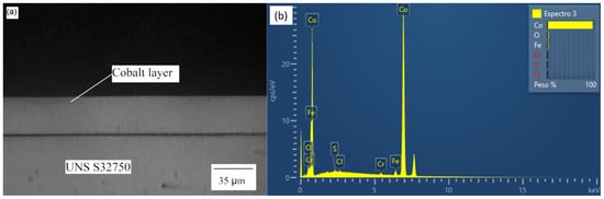 The optical micrograph and EDS diagram for the sample Co35 are presented in Figure 2. The other two samples (Co12 and Co20) had the same behavior. The composition of the electrodeposited layer was approximately 95% Co; the remaining 5% of Fe and Cr were probably from the base metal. The layer showed constant thickness, adhered well to the surface of the base metal, and was not affected by relevant present porosity. These characteristics contribute to a weld bead without discontinuities and achieves a uniform austenite/ferrite proportion distribution [29,33].