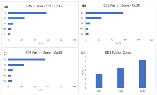 The cobalt enrichment, promoted by the electroplating technique, is estimated in Figure 5, which shows the composition (wt.%) of the fusion zone obtained by EDS analysis for the samples Co12, Co20, and Co35 (a, b, and c, respectively). The values shown are the average amounts (wt.%) of Fe, Cr, Ni, Mo, and Co in the melting zone. The Cr, Ni, Fe, and Mo concentrations remained the same of the base metal (Table 1). The cobalt amounts in the fusion zones were from the cobalt coating since the base metal does not have cobalt in its composition. Figure 5d presents the increase in cobalt amounts in the fusion zones for all the samples. The increase in cobalt amount increased the volume fraction of austenite, corroborating the results observed in the micrographs and proving the efficiency of the cobalt as austenite former [20,21,23].