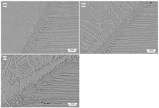 Figure 4 displays the SEM micrographs of the fusion zone for the Co12, Co20, and Co35 samples (a, b, and c, respectively). Austenite appears as the lightest phase and ferrite as the darkest. Thicker electrodeposited layers lead to an increase in cobalt concentration, which altered the morphology of austenite and increased its volume fraction. The sample Co12 had an unbalanced microstructure with several polygonal ferrite grains and allotriomorphic austenite at the boundaries. In SDSS welding, austenite is formed from a diffusional solid-state transformation so that, under high cooling rates as is usual for pulsed laser welding, the austenite formation cannot fully develop [6,33]. The effect of cobalt, as an austenite former, was not sufficient to overlap the thermal cycle effects imposed by laser welding.