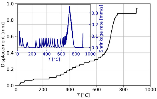 Temperature-dependent displacement curve (black solid line) recorded during the sintering process of specimen 1. Inset highlights the derived corresponding shrinkage rate (blue solid line).