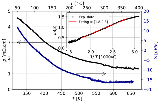 Temperature dependence of electrical resistivity (black open circles, left y-axis indicated by the left arrow) and Seebeck coefficient (S) (dark blue open circles, right y-axis indicated by the right arrow) measured after RSPS. Inset highlights data in an Arrhenius presentation. The red solid line indicates the result of a linear fit to the data representing an activation energy E≈ 0.145 eV.