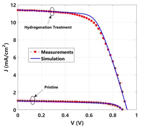 J-V characteristics of hydrogenated and pristine cells for measurements vs. SCAPS simulations.