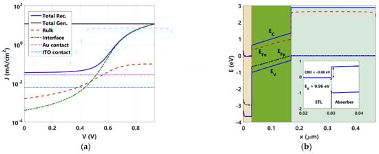 Now, referring to Figure 3b, it is obvious that the SnO2/Cs2AgBiBr6 interface is of a cliff style as the CBO is −0.68 eV. The activation energy is also indicated in the inset of the figure, which has a value of 0.96 eV. The results clearly reveal the inappropriate design of this CBO. On the other hand, it is depicted in Figure 3b that the band alignment is suitable for the Cs2AgBiBr6/Sprio-OMeTAD interface as electron blocking is satisfied. In addition, the hole transport from the Cs2AgBiBr6 active layer to the HTL is facilitated via the small offset. Based on these results, one can conclude that the main issue in the initial cell comes from the improper alignment manifested from the CBO, while the VBO has no issue. It should be pointed out here that the alignment of SnO2 with the ITO contact is suitable as the majority carrier barrier height is about 0.357 eV, which, to a high extent, does not affect the hole injection into the contact.