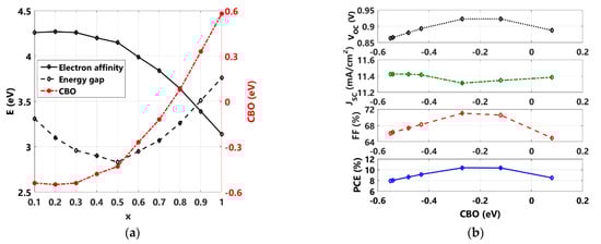 A suitable candidate that can be combined with SnO2 to form a double ETL is the ternary compound Zn(O, S), which has a lot of advantages that include its bandgap and affinity tunability as well as its high mobility. It has been experimentally realized in a double Zn(O, S)/CdS ETL and showed promising results [59]. The energy gap and the electron affinity of ZnO1-xSx vary from 3.30 eV to 3.76 eV and from 4.50 eV to 3.14 eV, respectively, upon increasing the sulfur composition (x) from zero to one. Other electrical and optical parameters for ZnO1-xSx are obtained from the literature to continue the simulation [59,60]. The change in the electron affinity and the energy gap against x is illustrated in Figure 4a [59,60]. Moreover, the CBO between ZnO1-xSx and Cs2AgBiBr6 is shown.