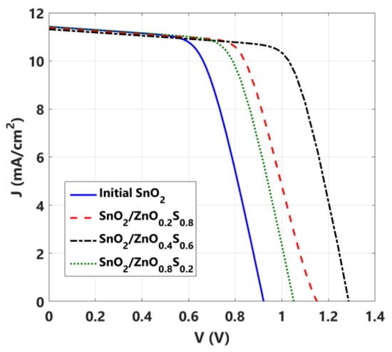The previous results can be assessed by drawing the J-V characteristics as shown in Figure 5 where four cases are shown in the figure. The first case is regarding the initial cell with a single SnO2 ETL. The other three cases represent the difference between various CBO values. For CBO = +0.08 eV, the compound used is ZnO0.2S0.8 (as x = 0.8), while for CBO = −0.55 eV, the compound used is ZnO0.8S0.2 (as x = 0.2). The final case is for the optimal PCE, which occurs when using ZnO0.4S0.6 (corresponding to CBO = −0.27 eV). Moreover, a physical explanation of the behavior of the cell upon applying the DETL design can be understood by drawing the energy band diagram for the three design cases. As clearly indicated in Figure 6, there are two competing band offsets that may influence the performance. Regarding Figure 6a, which illustrates the case of SnO2/ZnO0.2S0.8, although the band alignment at ZnO0.2S0.8/Cs2AgBiBr6 is a suitable small spike band, the extremely high barrier at the SnO2/ZnO0.2S0.8 interface is the main cause to limit the carrier flow. That is to say, the carriers are easily injected from the absorber but face an obstacle at the interface between the two ETLs. On the other hand, while the band offset at the ZnO0.4S0.6/Cs2AgBiBr6 interface is a cliff band (see Figure 6b), the barrier between the two ETLs becomes slower, and the carrier transport is enhanced. Finally, regarding Figure 6c, the cliff band becomes severe and, in turn, recombination will be very large. Although, in this case, the barrier between the two ETLs is the lowest amongst the three cases, the transport is minimal due to the cliff at the ZnO0.8S0.2/Cs2AgBiBr6 interface. This behavior is apparently reflected on the J-V curve given in Figure 5.