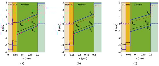 Eventually, higher PCEs are achieved in type-I ETL/absorber interface that is characterized by a spike-type junction in which the CBO is positive [53]. Notably, the CBO is calculated as the difference between the electron affinities at the absorber and ETL sides (i.e., CBO = χabsorber − χETL). For small positive values of the CBO, the charge carriers flow is appropriate, resulting in a prevalent recombination mechanism in the bulk (absorber), which is desirable [54]. However, if the CBO is high enough, a barrier will be formed, causing a hurdle to the electron transport. On the other hand, when the CBO is negative, a cliff-type junction occurs, which does not prevent electron transport; however, the activation energy (EA) is lower than the absorber bandgap, resulting in increased interface recombination compared to the bulk recombination, causing a degraded functioning [54,55]. The previous discussion is, however, valid for the single ETL design.