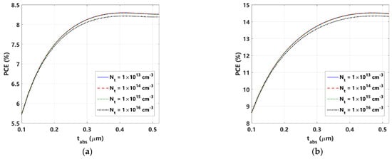 The variation in the PCE against the absorber thickness and defect density (Nt) is exhibited in Figure 7 for two cases, namely the initial cell in which a single ETL is adopted (Figure 7a), while the second case is corresponding to the optimum case obtained from the double SnO2/ZnO0.4S0.6 ETL design (Figure 7b). In this simulation, tabs is varied in the range 100 nm to 520 nm while Nt is varied from 1 × 1013 to 1 × 1017 cm−3. It can be inferred from the figure, for both cases, that as the absorber becomes wider, the PCE progressively enhances thanks to the improvement in photon absorption. When the absorber thickness becomes higher than 300 nm (for the single ETL case) or 350 nm (for the DETL case), the PCE becomes almost unchanged. This is due to the fact that the thickness is now comparable to the diffusion length and any further increase in the thickness will result in more bulk recombination, which will deteriorate the performance. It is also noted that the impact of the defect density is minor in proportion to that of the absorber thickness. Therefore, to obtain an enhanced PCE, it is adequate to control the thickness while keeping reasonable trap densities. Increasing the thickness beyond 300 nm can result in a PCE of higher than 8% or 14% in the case of the calibrated cell or the double ETL cell, respectively.