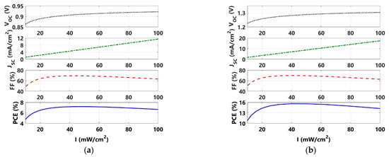 To investigate the possibility of the presented lead-free PSC for use in indoor applications where the light intensity is low, the initial cell and an optimized double ETL cell are simulated under low levels of intensity. When simulating the initial cell, all parameters indicated in Table 1 are applied. On the other hand, when simulating the double ETL cell, an optimized thickness of 400 nm is taken while keeping the same initial trap density. Figure 8 shows the results in terms of the PV parameters for the initial cell (Figure 8a) and optimized DETL cell (Figure 8b). It can be depicted in the trend of the cells that despite the decline in VOC and JSC, the FF is enhanced when the light intensity deceases until 40 mW/cm2. As the input power becomes lower for reduced intensities, the overall impact is that the PCE slightly boosts. For lower intensities below 40 mW/cm2, the PCE significantly decreases due to the dominant effect of both VOC and JSC. The presented results reveal the suitability of the designed cell to be utilized in indoor applications down to a certain low light intensity level.