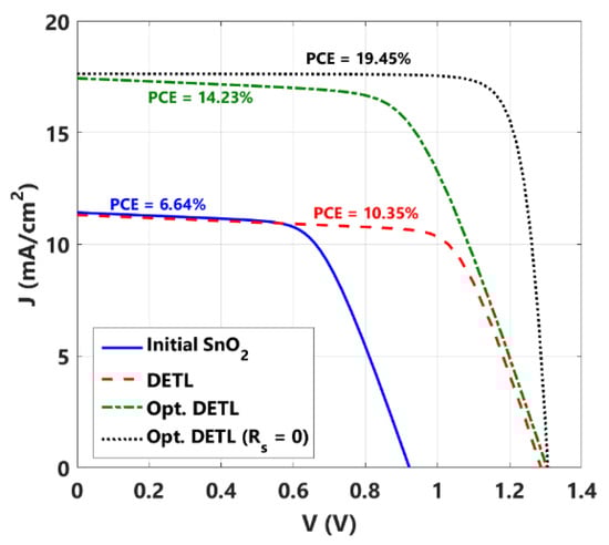 Finally, to compare the initial cell and other designed DETL cells, the J-V characteristics are presented in Figure 9. Moreover, the figure shows the case when neglecting the effect of the series and shunt resistance to give a figure of merit of the efficiency promotion limit. The PCE of each case is highlighted in the figure. Additionally, Table 3 addresses the PV parameters of the design cases of DETL (with and without absorber optimization) besides the corresponding parameters of some state-of-the-art Cs2AgBiBr6-based solar cell devices either from simulation or experimental research studies. The main absorber parameters are also indicated in the table. The table obviously demonstrates the crucial impact of the bandgap energy. Despite the higher values of the VOC when Eg is high, the reported PCEs are lower than those reported for lower Eg mainly because of the low JSC. Based on the current simulation, we believe that the combination of ETLs along with growing relatively thicker Cs2AgBiBr6 films would pave the way for obtaining high efficiency Cs2AgBiBr6-based solar cells which are non-toxic and eco-friendly that can be suitable for many applications. To further boost the efficiency of Cs2AgBiBr6-based devices, more experimental work should be carried out in order to improve the quality of the bulk and interfaces to minimize the defects and thus lower recombination losses. A high-quality absorber, low interfacial recombination velocities, and good contacts to reduce Rs are extremely needed to reach the theoretical efficiency which is about 29.5% on the ground of the ideal Shockley–Queisser limit, given a bandgap of 1.64 eV [61].
