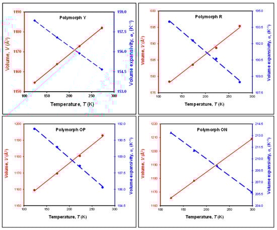 The expansivities along different crystallographic axes and angles are summarized in Table 1. An analysis of axial and angular expansivity provides information for identifying the lattice component of a crystal structure making the greatest contribution to the overall volume expansivity of a crystal. For all four polymorphs, the three axes, a, b, and c, undergo linear expansion with increase in temperature. However, expansion along different cell axes in each polymorph is highly anisotropic. Anisotropy in thermal expansivity is common in molecular crystals, including polymorphs [29,30,31,32]. For polymorph Y, the maximum axial expansivity occurs in the direction of the b axis, while the maximum expansivities of polymorphs R, OP, and ON all occur along the a axis.