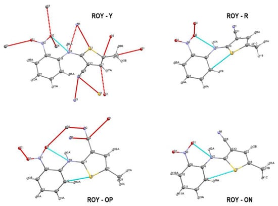 Hydrogen bonding motifs in different ROY polymorphs at 123 K. Polymorph Y has the largest number of intermolecular hydrogen bonds (red dotted lines), while polymorph ON has none. Intramolecular hydrogen bonds are shown as teal lines.