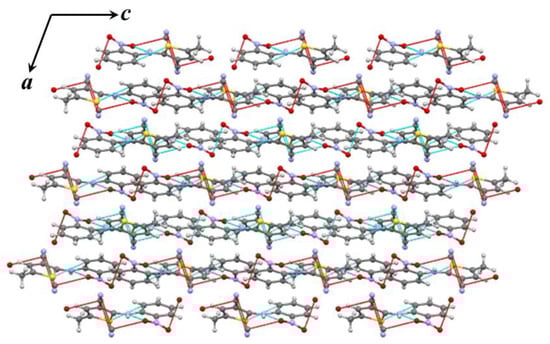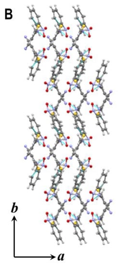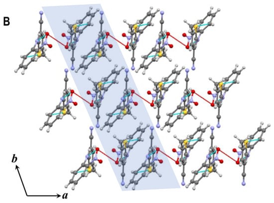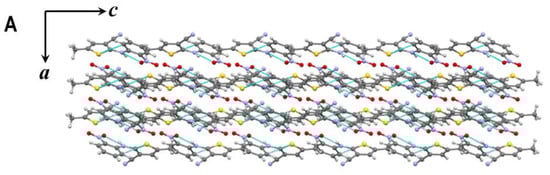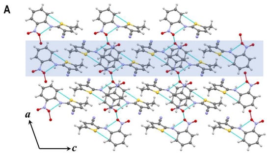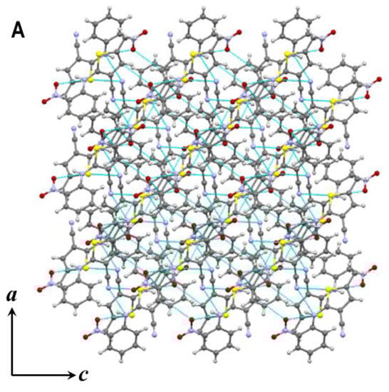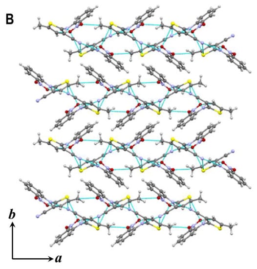 In polymorph Y, several intermolecular hydrogen bond interactions with N–H and C–H as hydrogen bond donors are observed (Figure 3 and Table 2). These interactions are relatively weak (hydrogen bond with lengths >3 Ǻ) [33,34] and the bond length increases significantly with increasing temperature (Table 2). However, when these interactions work together while constructing the molecular packing in the Y polymorph, they create and fortify a dense hydrogen-bonded network along the a and c axes of polymorph Y (Figure 4A). Packing is visibly much less dense along axis b, where molecules are arranged in alternating dimers with no intermolecular hydrogen bond interactions running along direction b (Figure 4B). Interestingly, the maximum axial expansivity occurs along axis b in polymorph Y (Table 1), corresponding to the direction of less dense packing of molecules.