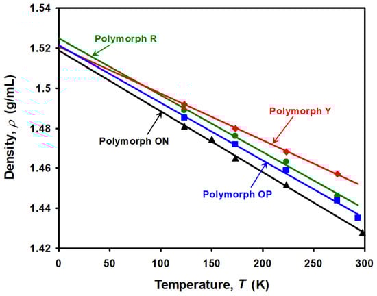 An important consequence of the different thermal expansivity of polymorphs is the possible violation of the density rule. Polymorph Y has the lowest free energy among the four ROY polymorphs below ~70 °C [26,28]. At room temperature, polymorph Y has the highest density, and hence the closest packing, which is consistent with its thermodynamic stability. Thus, density is a good predictor of stability of Y with respect to other polymorphs at room temperature. However, the significant differences in the volume expansivities of the four polymorphs suggests the possibility of crossover of their thermal density lines (Figure 8). When density lines cross, the density rule is necessarily violated at a temperature either below or above the density crossover temperatures (Td), since the density order of polymorphs switches when temperature passes Td. In fact, despite being the most thermodynamically stable, polymorph Y does not have the highest density at absolute zero, owing to the density crossover phenomenon (Figure 8).