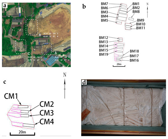 In 2014, during the construction of the Chuanshi vehicle section of Line 7 of the Chengdu Metro in Sichuan Province, China, a large Ming dynasty burial site was discovered. Sichuan Province is located in the southwest of China. The distribution of burials is shown in Figure 1a, and the distribution in Areas B and C is shown in Figure 1b, c. The burial sites have been proven to be the burial ground of the eunuchs of the Shu King in the Ming dynasty. These tombs are all stone constructions and decorated with paintings and carving on the stone surface, with gilding in some areas. These painted stone carvings are of great historical, artistic, and scientific value. Due to the complex and changing environment of the archaeological excavation site, the Chengdu Institute of Cultural Relics and Archaeology decided to relocate the cultural relics to protect them better and display the painted stone carvings. In 2016, after nearly two years of in situ conservation, 23 tombs of higher value in tombs 1 to 19 in Area B and tombs 1 to 4 in Area C were selected for relocation. The painted stone carvings were packed into custom-made wooden boxes containing cushioning material. They were then covered layer-by-layer with rice paper and a soft cloth to insulate the cultural relics from the outside environment. A photograph of the interior of the wooden box is shown in Figure 1d. Then, they were stored in Pujiang Museum in Chengdu, Sichuan. They were sealed and preserved until 2020. In May of 2020, when the tombs were unpacked and inspected, it was found that the painted stone carvings had suffered severe deterioration in the form of paint loss, salt efflorescence, biodeterioration due to microbial proliferation, and punctate loss which means that the paint layer was peeling off in the form of dots. Thus, these painted stone carvings urgently needed conservation and restoration.