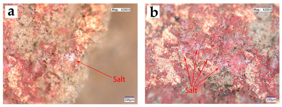 In order to clarify the microscopic morphology of the salt efflorescence, sample 1 was placed under an OM. The results show that the salt efflorescence is distinctly granular, mainly on the surface of the red pigment layer, with negligible diffusion in the stone substrates, as shown in Figure 3.