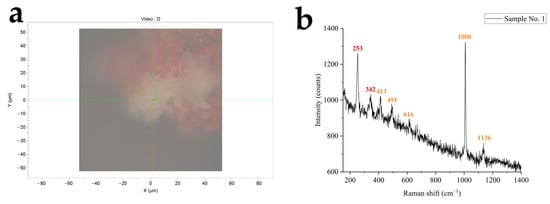 In order to determine the type of this salt efflorescence, Raman was performed on the salt efflorescence of sample 1. The results show characteristic peaks at 253 cm−1, 342 cm−1, 413 cm−1, 491 cm−1, 616 cm−1, 1008 cm−1, and 1136 cm−1. The characteristic peaks near 413 cm−1, 491 cm−1, 616 cm−1, 1008 cm−1, and 1136 cm−1 are similar to the standard peak of gypsum (CaSO4·2H2O) [17]. Moreover, the characteristic peaks at 253 cm−1 and 342 cm−1 are consistent with the Raman spectrum of cinnabar (HgS) [18], which is presumably the result of laser light passing through the surface layer of salt efflorescence to the underlying red pigment layer. The Raman tested point and characteristic peaks for sample 1 are shown in Figure 4.