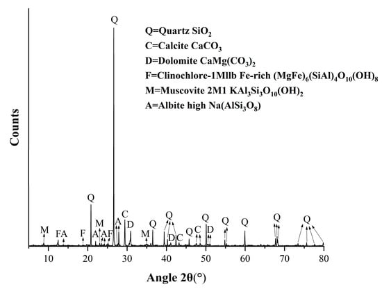 In order to confirm the composition of stone sample 5, XRD analysis was performed on the stone sample. The results are shown in Figure 5, which contains quartz, calcite, dolomite, and kaolinite. Comparing stone sample 5 with the sandstone used to build the towers at La Galea Fortress (Gexto, northern Spain), both contain quartz, calcite, and kaolinite. The absence of dolomite in the La Galea samples may be related to the geological setting. However, samples from La Galea Fortress contain rock weathering by-products such as gypsum and thenardite [24]. In contrast, these painted stone carvings in the study are cultural relics that were unearthed; therefore, the rock’s interior is less damaged.
