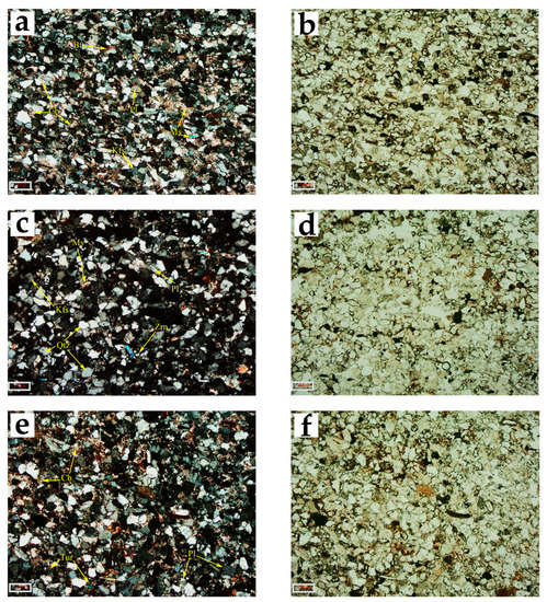 Petrographic microstructure of sample No. 5. (a,c,e) are the petrographic microstructures in the orthogonally polarized view and (b,d,f) are the corresponding single polarized view. “Qtz” means quartz; “Kfs” means K-feldspar; “Pl” means plagioclase; “Bt” means biotite; “Ms” means muscovite; “Cb” means carbonate mineral; “Zrn” means zircon; “Tur” means tourmaline.