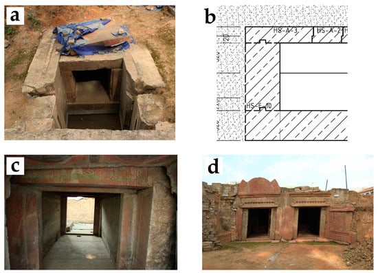 China is the third-largest acid rain region in the world, with 40% of its area affected by acid rain [26]. These painted stone carvings were excavated in Jinjiang District, Chengdu, Sichuan Province, and the Sichuan Basin is a high-incidence area for acid rain in China. From 2006 to 2013, Zhao et al. analysed the characteristics of acid rain changes in Sichuan. They showed that the probability of acid rain in Chengdu was 61.5% and the pH value was 4.28, which was strongly acidic [27]. Zhang Yanmei studied PM2.5 on hazy days in Chengdu and found that NO3− and SO42− dominated the anions, while NH4+, Na+, and Ca2+ dominated the cations [28]. Moreover, the Ming tomb used mortise and tenon joints, with significant spaces between certain stones. Due to the unstable geological substrate, this group of tombs also exhibited structural damage, such as north–south misalignment and general deformation. The construction and state of preservation of the burial chambers are shown in Figure 7.