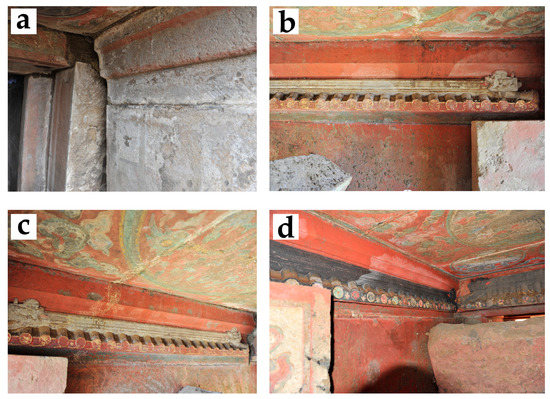 Water stains and white material in the burial chamber at the excavation site. (a) Area B, tomb 1; (b,c) Area B, tomb 3; (d) Area B, tomb 4.
