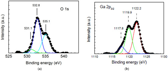 Figure 1 shows the XPS spectra of (a) O 1s and (b) Ga 2p3/2 for sample SP20. In Figure 1a, the O 1s spectra show the three oxygen signals with binding energy 531.1 eV, 533.5 eV, and 535.1 eV, respectively. The peak at 531.1 eV is ascribed to lattice oxygen in Ga–O bonding [17]. The peak at 532.8 eV is attributed to the C-related O state [18] and or O–H bonds [19]. For the film prepared by mist-CVD, carbon and hydrogen species in the precursor may be incorporated into the film in the deposition process. The peak at 535.1 eV shows the characteristic peaks of O in β-Ga2O3 [20]. In Figure 1b, the Ga 2p3/2 consists of three components at 1122.2 eV, 1119.9 eV, and 1117.8 eV were observed. The peaks located at 1122.2 eV and 1119.9 eV are known to Ga in Ga-O bonding for β-Ga2O3 structure [20] and α-Ga2O3 structure [21], respectively. The peak at 1117.8 eV was attributed to Ga 1+ oxidation state in Ga2O bonding and may be formed in the interface through the decomposition of the Ga2O3 source [22,23]. As the calculated core state binding energy difference for the same atom in the primitive unit cell is small, the broadness of the binding energy in XPS may originate from the instrumental broadening and the carrier lifetime broadening of the excitations [24].