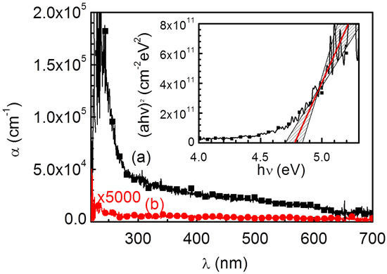 Spectral dependences of the absorption coefficient for (a) Ga2O3 thin film and (b) the quartz glass substrate. The inset shows the corresponding Tauc plot of Ga2O3.