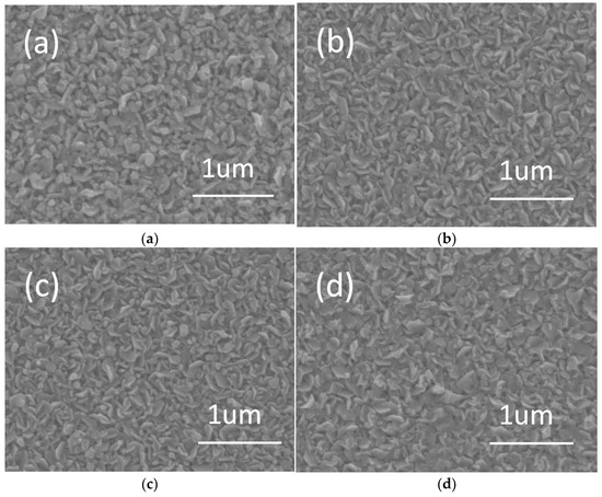 Figure 5 shows the surface morphology of samples (a) AT0, (b) AT1, (c) AT3, and (d) AT7. The surface morphology with combined hexagonal flakes and small rods was observed for the AT0 sample. This surface expresses a morphology originating from the spray pyrolysis process with magnesium nitrate hexahydrate and zinc acetate dehydrate precursors. With the introduced thin Ga2O3 layer between MgZnO:Er and ZnO:In layer, similar morphology for samples AT1, AT3, and AT7 can be observed.