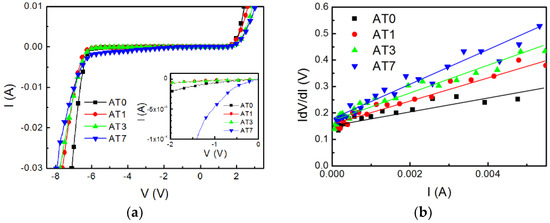 (a) The current−voltage (I−V) characteristics of samples AT0, AT1, AT3, and AT7 measured at room temperature. The insect shows the fine-scale in 0 to −2 V region. (b) The IdV/dI−I plot for extracting the diode ideality factor and series resistance.