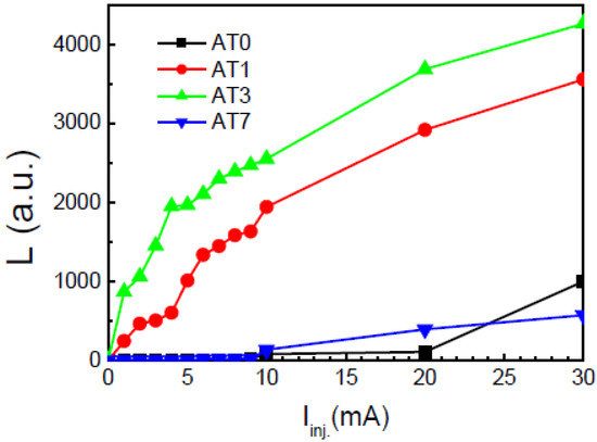 The luminescent intensity (L)-injection current (Iinj.) characteristics for diode AT0, AT1, AT3, and AT7.