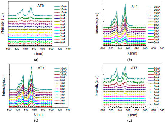 The luminescent spectrum of each sample under different reverse-biased injection currents is shown in Figure 8. The characterized emission spectrum around 533 nm and 553 nm was correlated to the Er3+ 2H11/2→4I15/2 and 4S3/2→4I15/2 energy state transitions [5], respectively. For samples AT0, AT1, and AT3, similar spectrum distribution for the two characteristic emissions was observed. Yet, the emission spectrum of sample AT7 is far from that of sample AT0 to AT3. In this rare earth-doped optoelectronic device, the characteristic emission is from the core of rare earth elements, while the spectral distribution is controlled by the host material. For samples AT0 to AT3, similar spectra reveal similar crystalline of the MgZnO:Er host. Varied emission spectra for sample AT7 shows the different crystalline. As a high turn-on current and a large dark current were characterized for sample AT7, reduced crystalline was expected for this sample. This reduced crystalline region may occur beneath the Ga2O3 in the deposition process while considering the diode structure.