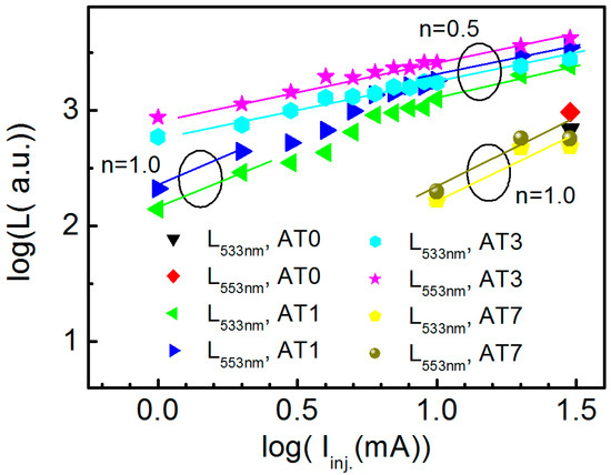Figure 9 shows the double logarithmic plot for the two characteristic emission intensities L533nm and L553nm for samples AT0, AT1, AT3, and AT7 to injection current (Iinj.) measured at room temperature. The power order n of emission intensity to injection current shows two branches, basically. For AT1, the intensity L to injection current (Iinj.) shows n = 1 (L ~ Iinj.1) with low injection current (<5 mA) and n = 0.5 (L ~ Iinj.0.5) with injection current excess 10 mA. The L-Iinj. relation with order n = 1 shows the direct pumping-relaxation mechanism, which was the same as that in the downconversion luminescence by low-power optical pumping. With increased injection current, the carriers at the excited state may take the impact excitation energy again to higher energy states and or the defect states of the host material. High energy carriers, thus, back to their initial state after the non-radiative depopulation mechanisms [37]. Few photons can be generated by this process. The reduced injection current power order (n < 1) for high injection current can be expected. For AT3, the emission intensity shows the injection current to the power order 0.5 (L ~ Iinj.0.5). This shows the high current injection condition for AT3. For the injection current 10 mA, both AT1 and AT3 show the same power order of 0.5. Thus the power order n = 1 for AT7 reveals that some measured current takes less contribution to photon generation as in the low injection condition. The low emission intensity in the power order n = 1 region, thus, can be realized. Moreover, it was known that the variation of intensity ratio for the rare earth element’s characteristic emissions might be referred to as the characteristic temperature [38]. As both intensities, L533nm and L553nm, in Figure 9 have the same trend for each sample, the intensity ratio (L533nm/L553nm) remains constant with the increase in Iinj. for all samples. The temperature variation in this operation range may be less.