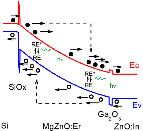 In the past decade, zinc oxide (ZnO) and its related materials have got certain interests in electronic and optoelectronic applications. Devices such as field effect transistors [1], photodiode [2], laser [3], and light-emitting diodes (LEDs) [4] have been reported with promising performance. For a non-toxic material with high chemical and thermal resistance properties, some interest arises in ZnO based on its large exciton binding energy (60 meV). This high binding energy character suggests ZnO is a favorable light-emitting device. Meanwhile, Si is the most important semiconductor material. The integrated Si and ZnO-based device has great attraction for further device development. One of these kinds of photonic devices, the silicon (Si) substrate integrated erbium (Er) doped ZnO/MgZnO light emitting diode [5,6], shows the promising Si-based photonic devices for communication as the Er-related green emission matches the low loss band of PMMA (polymethyl methacrylate) core optical fiber [7]. For this rare-earth element doped light emitting diode, a high reverse bias condition is generally required for ensuring high energy carrier generation and energy transformation to Er-related energy states after the impact excitation mechanism [5]. The light emission was observed by the relaxation process from the excited state to the ground state of the rare-earth element. For the diode under high electric field operation before light emission, certain currents can be characterized. A photonic device with a high turn-on current before light emission, thus, exhibits poor performance.