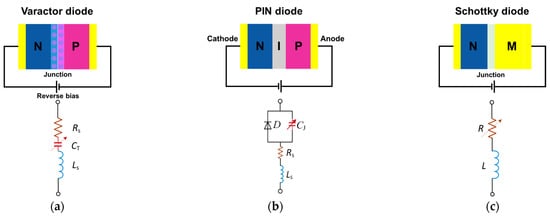 Differing from the classical p−n or PIN diode, the Schottky diode is formed by a metal–semiconductor junction, which typically has a low forward voltage drop and a very high switching speed [64]. Typically, the n−type semiconductor has a much higher electron concentration than the metal, so electrons move from semiconductor to metal by diffusion. When the diffusion and drift motion of electrons reach a balance, a Schottky barrier is formed [65]. Since Schottky diodes only use electrons as carriers without any accumulation of minority carriers, they have a small loss and switching time and can operate at high frequencies, including the terahertz range. Figure 1c illustrates a typical Schottky diode and its equivalent circuit at microwave frequencies. Similarly, a Schottky diode or Schottky junction can be described as a voltage−controlled resistor with smaller reactance with respect to the PIN diode. In addition, Schottky diodes have been widely used as high−frequency detectors and mixers in the front−end transmitters and receivers at millimeter−wave and terahertz frequencies [66,67,68,69,70].